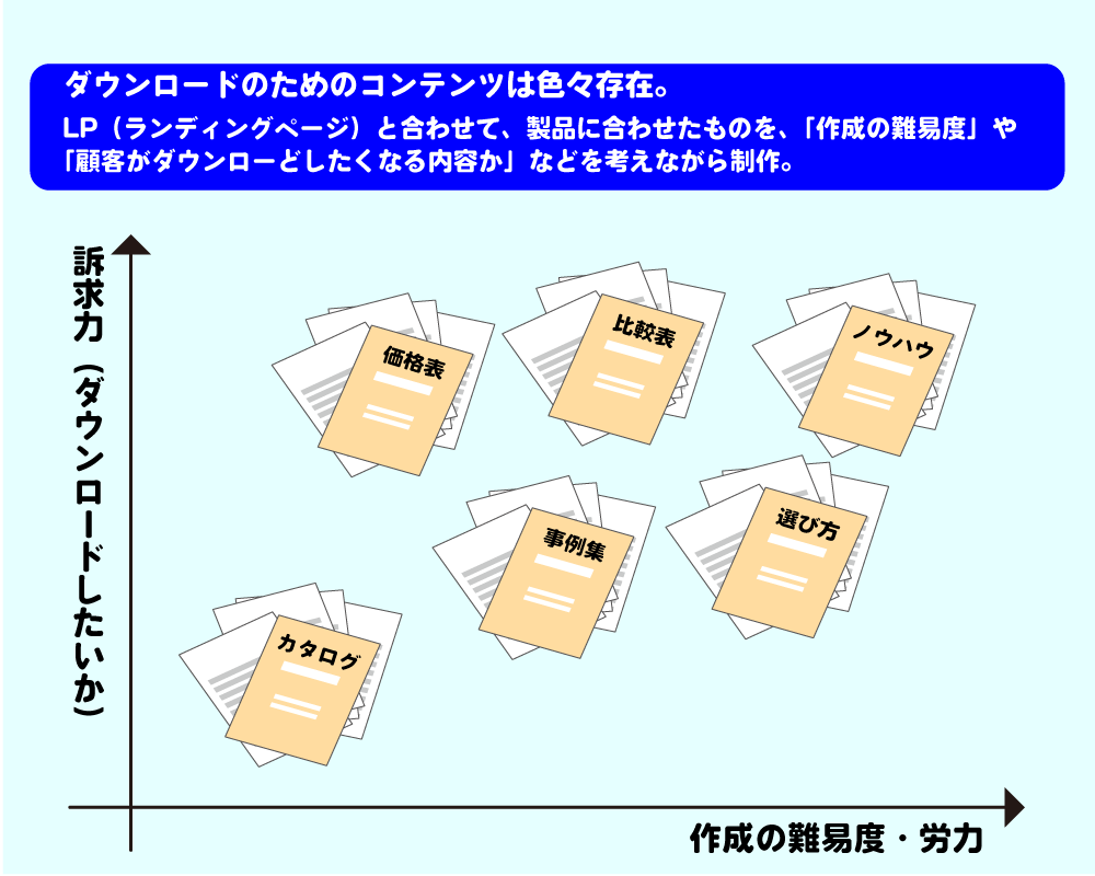 ダウンロードコンテンツは、例えば、「〇〇の選び方」、「〇〇に関する比較表」、「〇〇の価格表」などです。