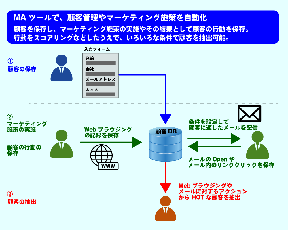 MA(マーケティング・オートメーション)ツールは、問い合わせがあった顧客をDBに取り込んで、定期的にメルマガを送付して接点を設けたり、Web訪問などの顧客行動から顧客の再検討の時期を知ることができます。
