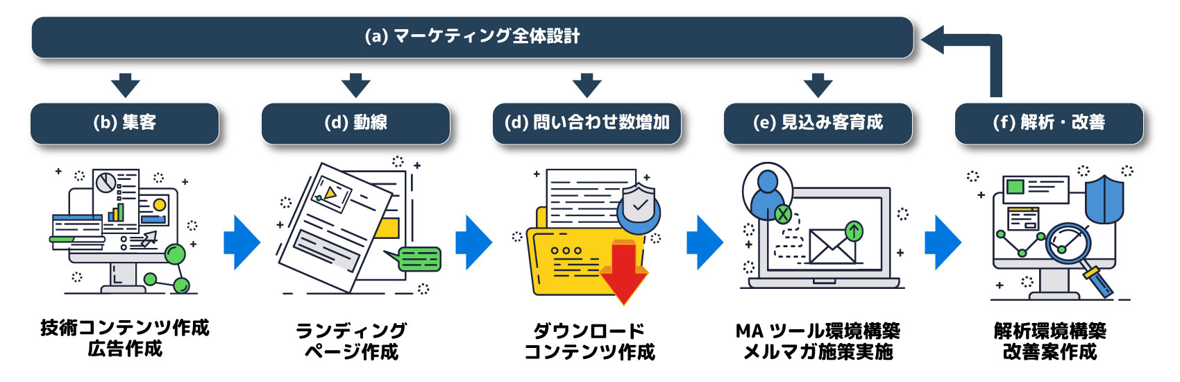 まず、マーケティングを始める際には、お客様から製品のことを伺い、全体設計をしっかりと実行していきます。