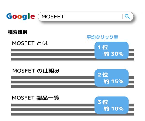 よって、”MOSFET"をGoogleで検索した際に一番上に表示されるWebページが作成できれば、MOSFETに興味のある人の流入を月に数千件程度見込めます。